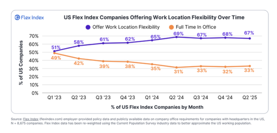 While the headlines suggest the "everyone's going back" narrative, the data tells a different story: 67% of U.S. companies still offer location flexibility, and structured hybrid is now the leading model at 43%. Only one-third of companies require full-time in-office attendance, according to the latest Flex Index Q2 report.